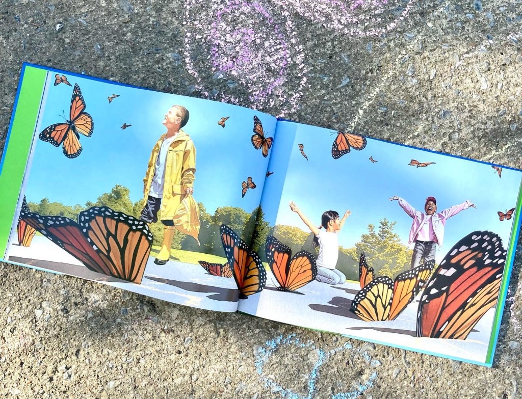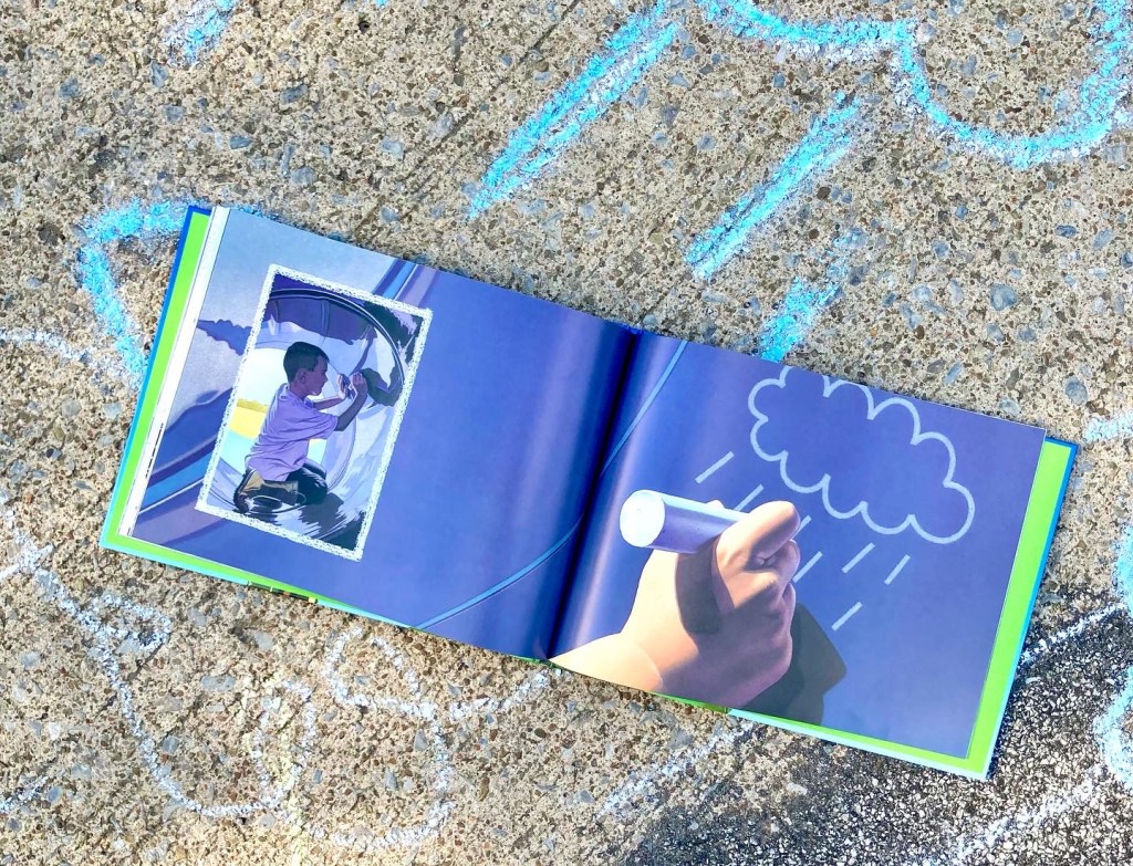 The artwork 🎨 is stunning. The light that Thomson makes and the shine of the playground almost make me feel like they are all about to come out of the book…maybe they will. 🌦️